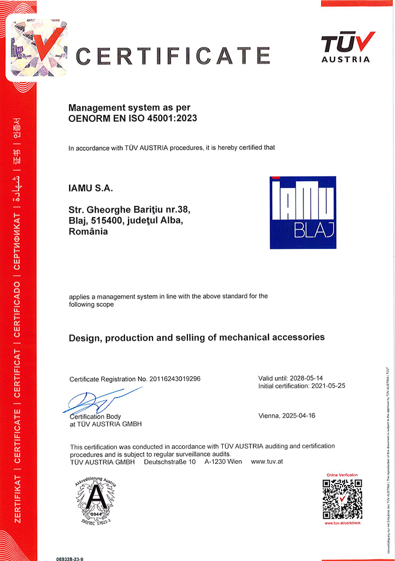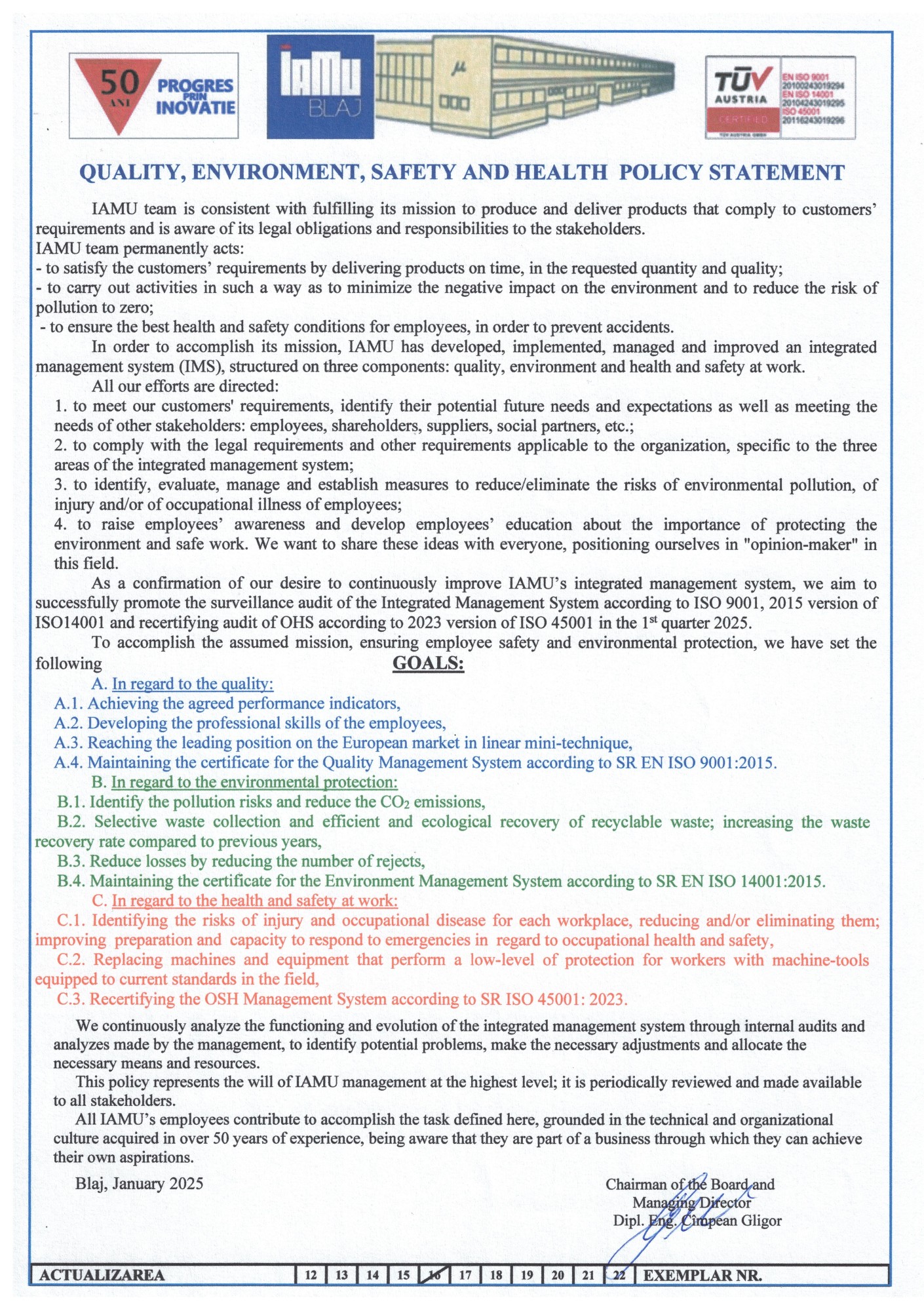 At SC IAMU SA Blaj, an Integrated Management System is implemented, certified, maintained and improved in the areas of Quality-Environmental Protection-Health and Safety at Work in accordance with the reference standards SR EN ISO 9001, 14001 and ISO 45001. The certificates are presented below.